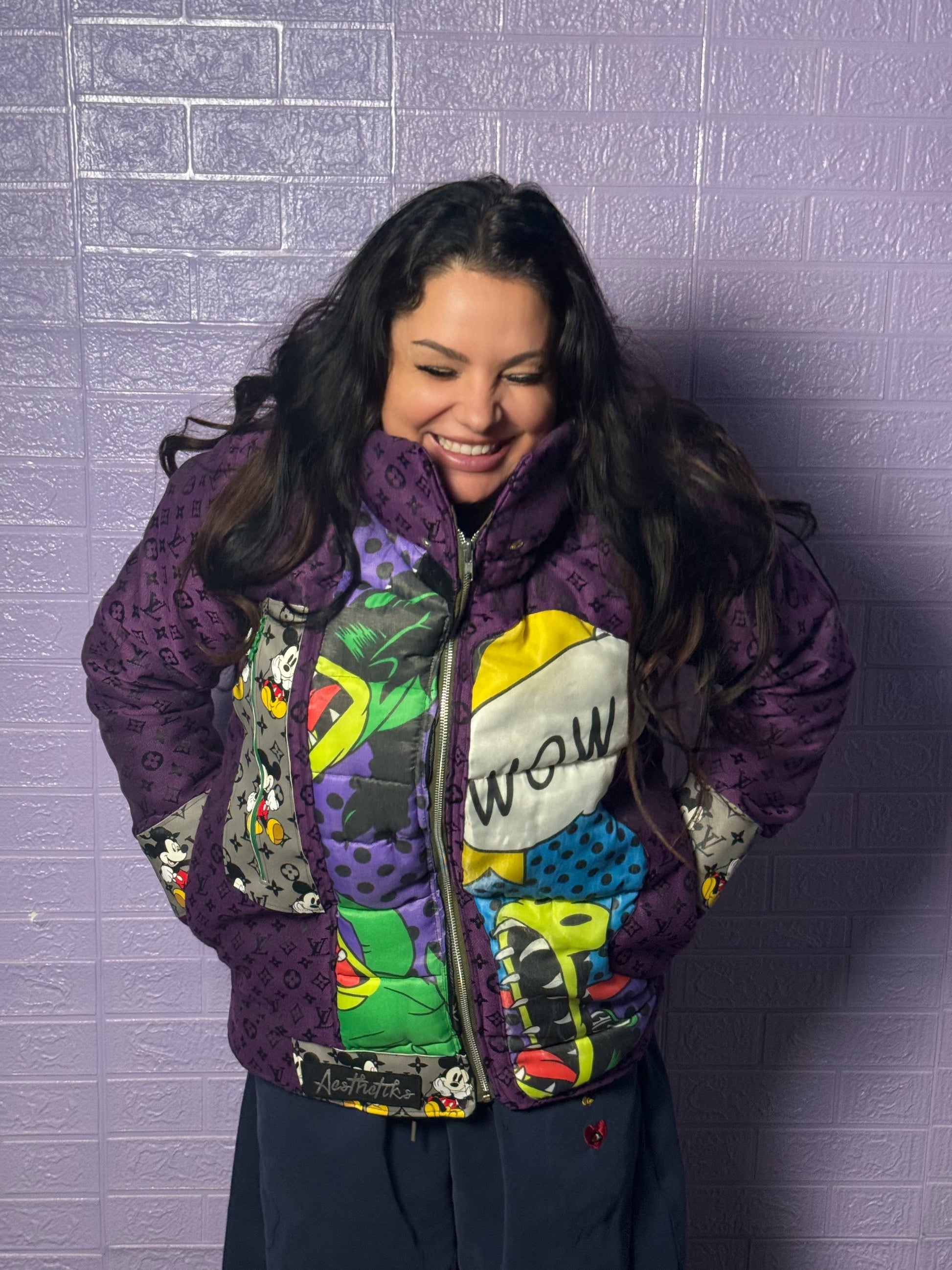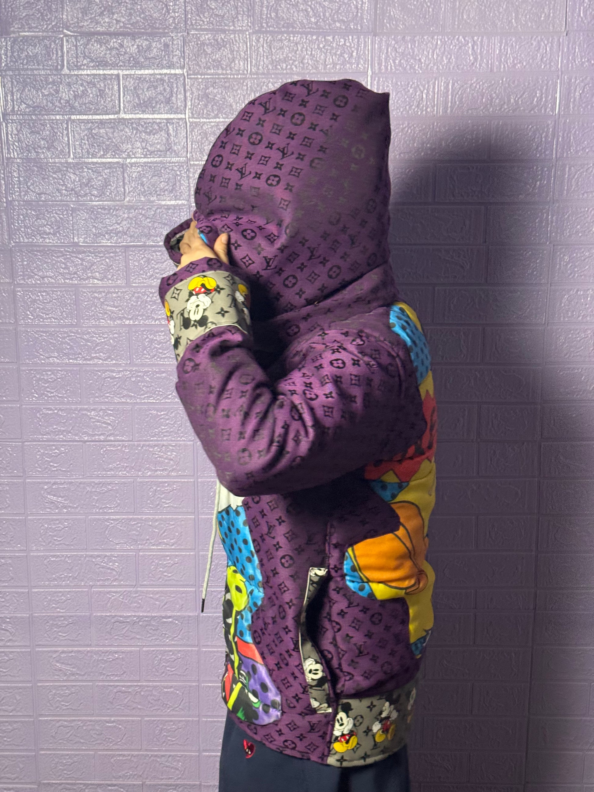 One of a kind lined removable hood puffer jacket. Created from a vintage sleeping bag & Purple LV Twill. Ladies Medium